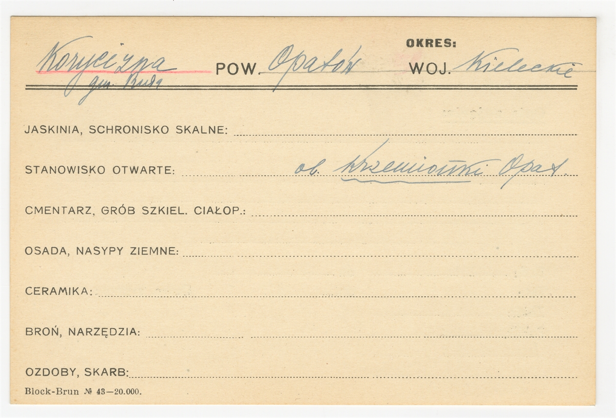 Karta stanowiska "Korycizna gm. Ruda pow. Opatów woj. Kieleckie" (druk rękopis) - strona 1