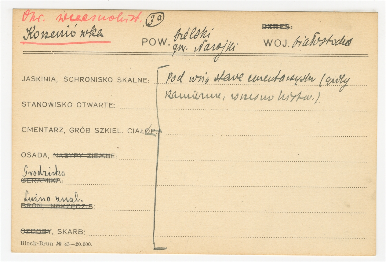 Karta stanowiska "Korzeniówka gm. Narojki pow. bielski woj. białostockie" (druk rękopis) - strona 1