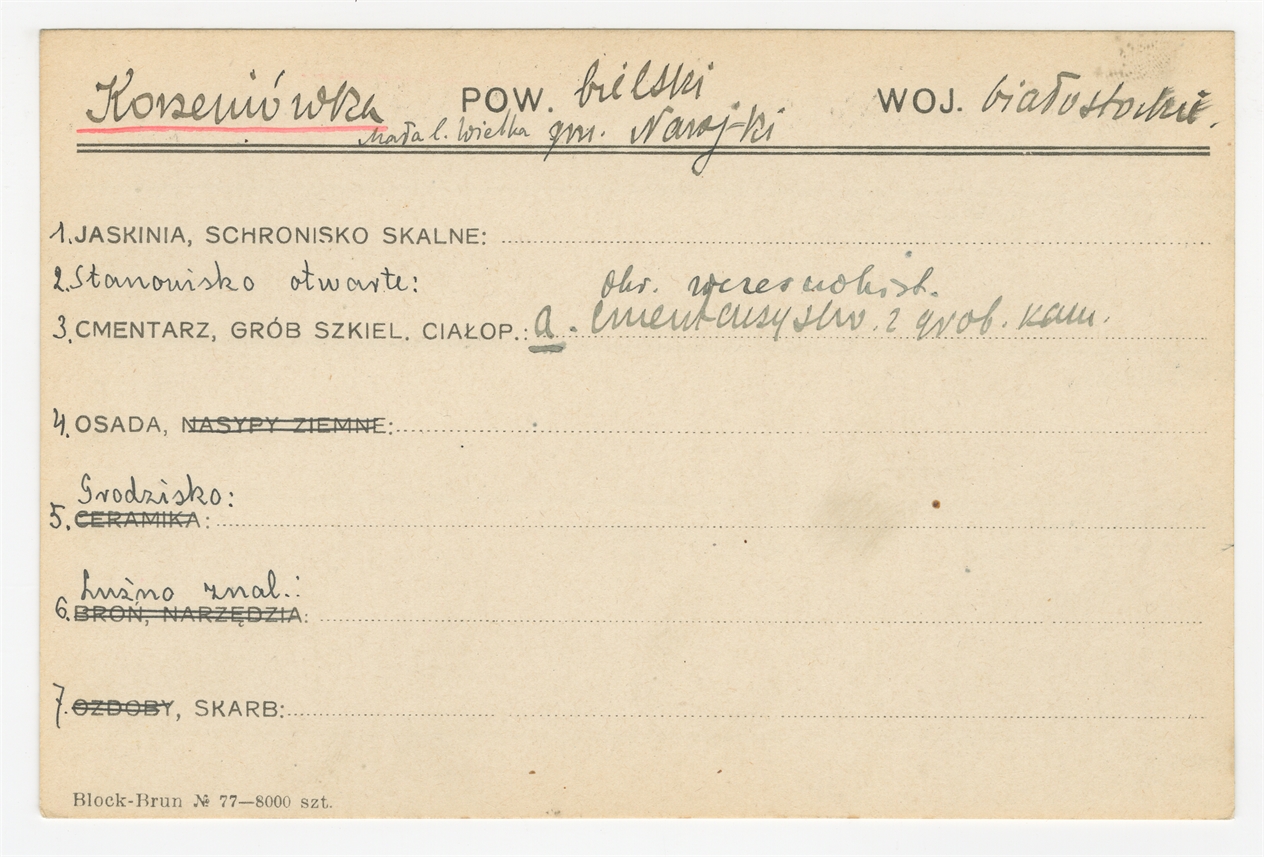 Karta stanowiska "Korzeniówka Mała l. Wielka gm. Narojki pow. bielski woj. białostockie" (druk rękopis) - strona 1