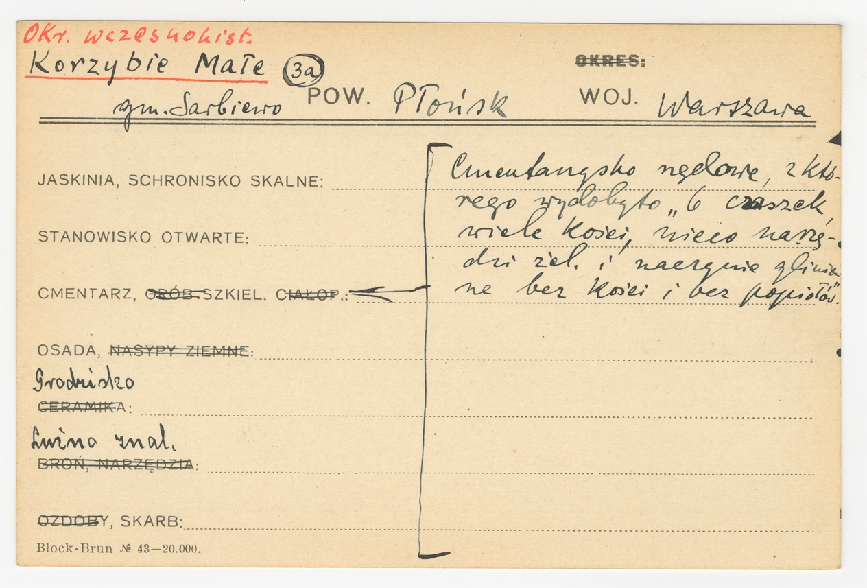 Karta stanowiska "Korzybie Małe gm. Sarbiewo pow. Płońsk woj. Warszawa" (druk rękopis) - strona 1