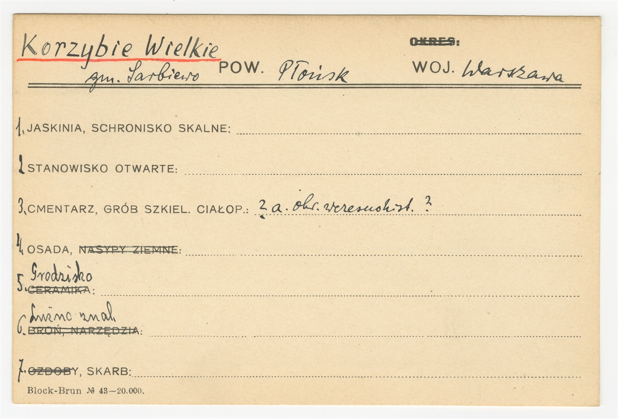 Element 1 - Karta stanowiska "Korzybie Wielkie gm. Sarbiewo pow. Płońsk woj. Warszawa" (druk rękopis) - strona 1