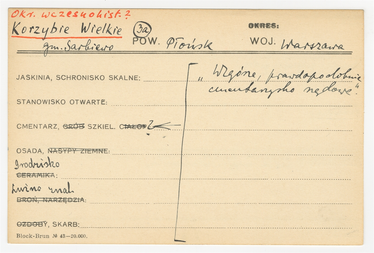 Element 1 - Karta stanowiska "Korzybie Wielkie gm. Sarbiewo pow. Płońsk woj. Warszawa" (druk rękopis) - strona 1