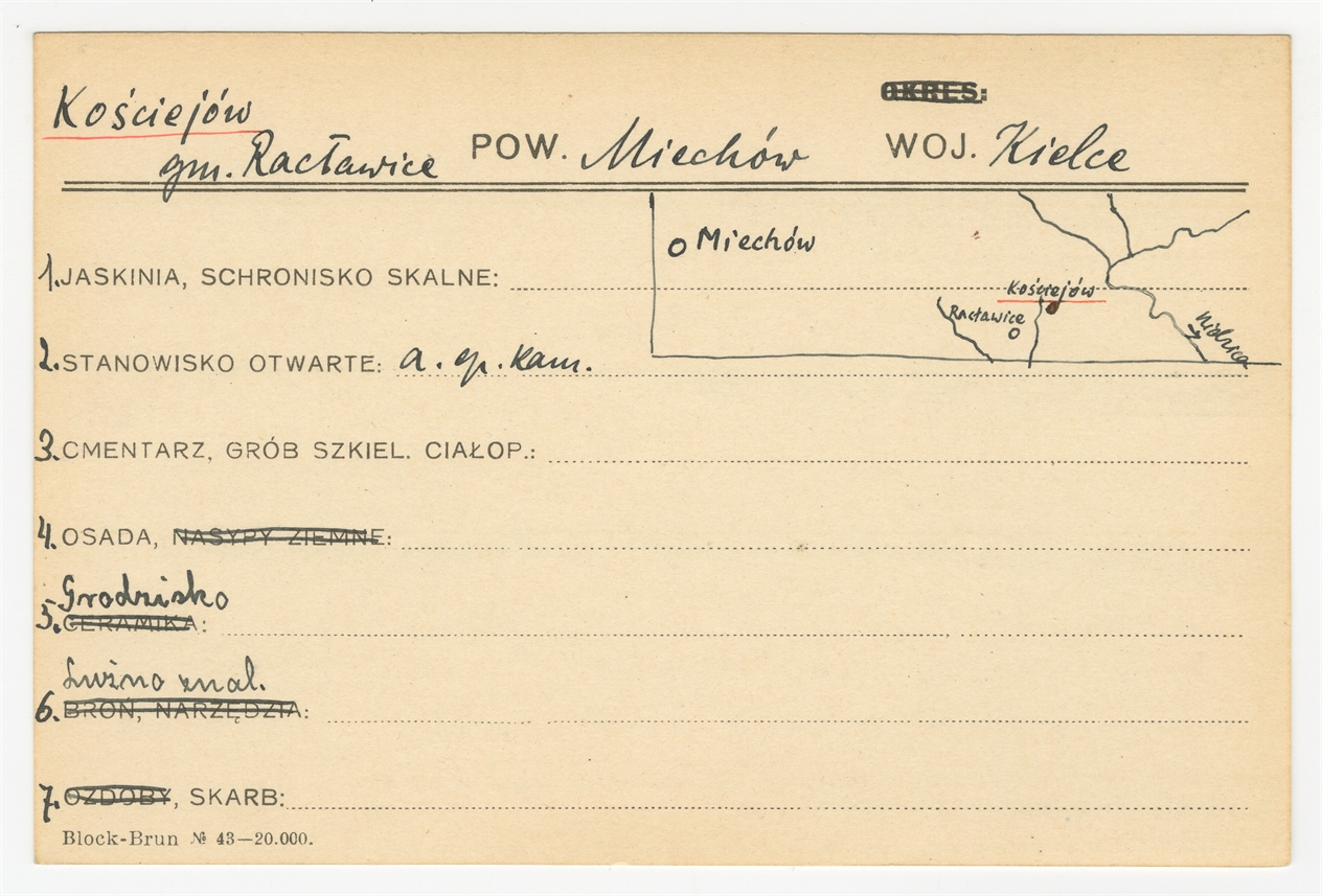 Karta stanowiska "Kościejów gm. Racławice pow. Miechów woj. Kielce" (druk rękopis) - strona 1