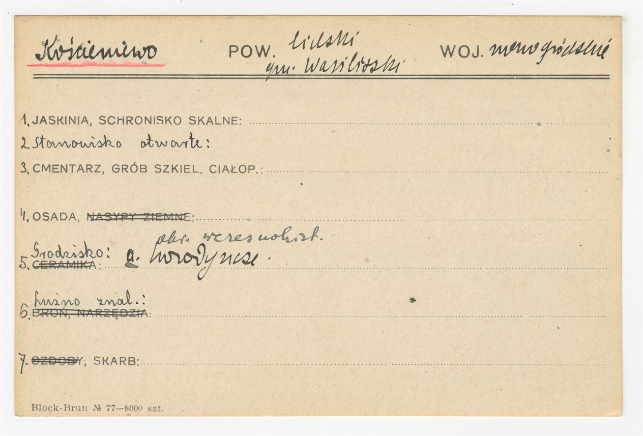 Karta stanowiska "Kościeniewo gm. Wasiliszki pow. lidzki woj. nowogródzki" (druk rękopis) - strona 1