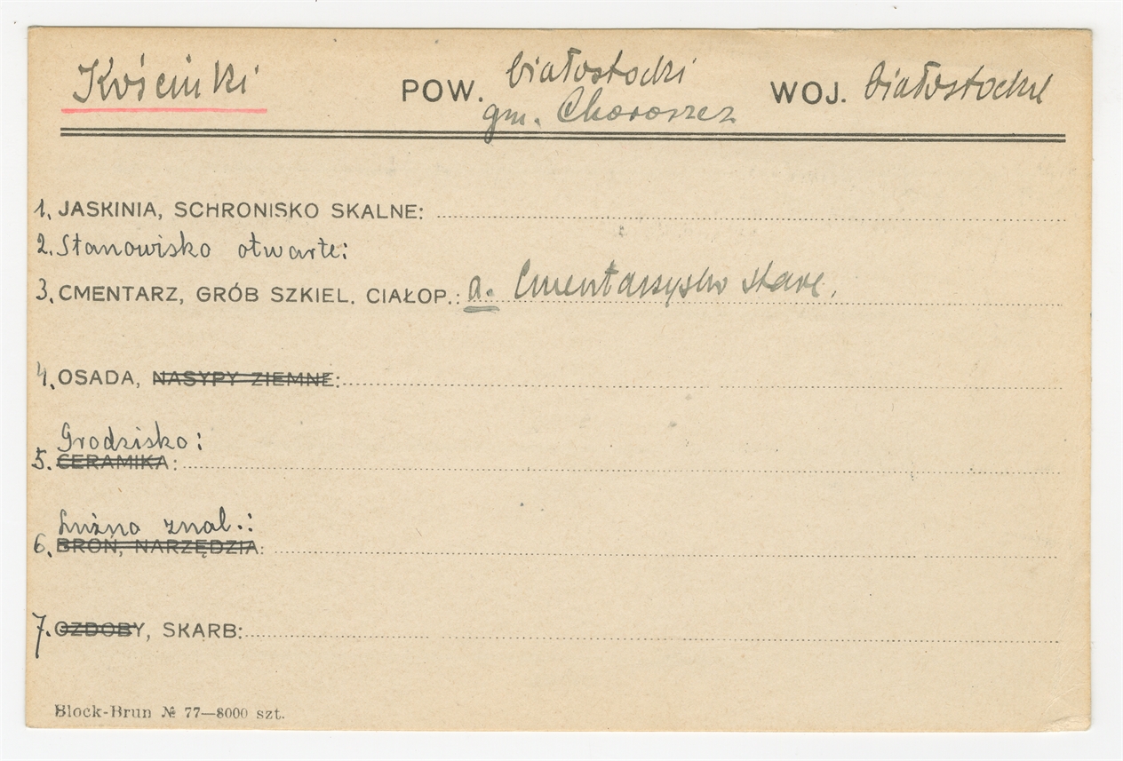 Karta stanowiska "Kościuki gm. Choroszcz pow. białostocki woj. białostockie" (druk rękopis) - strona 1