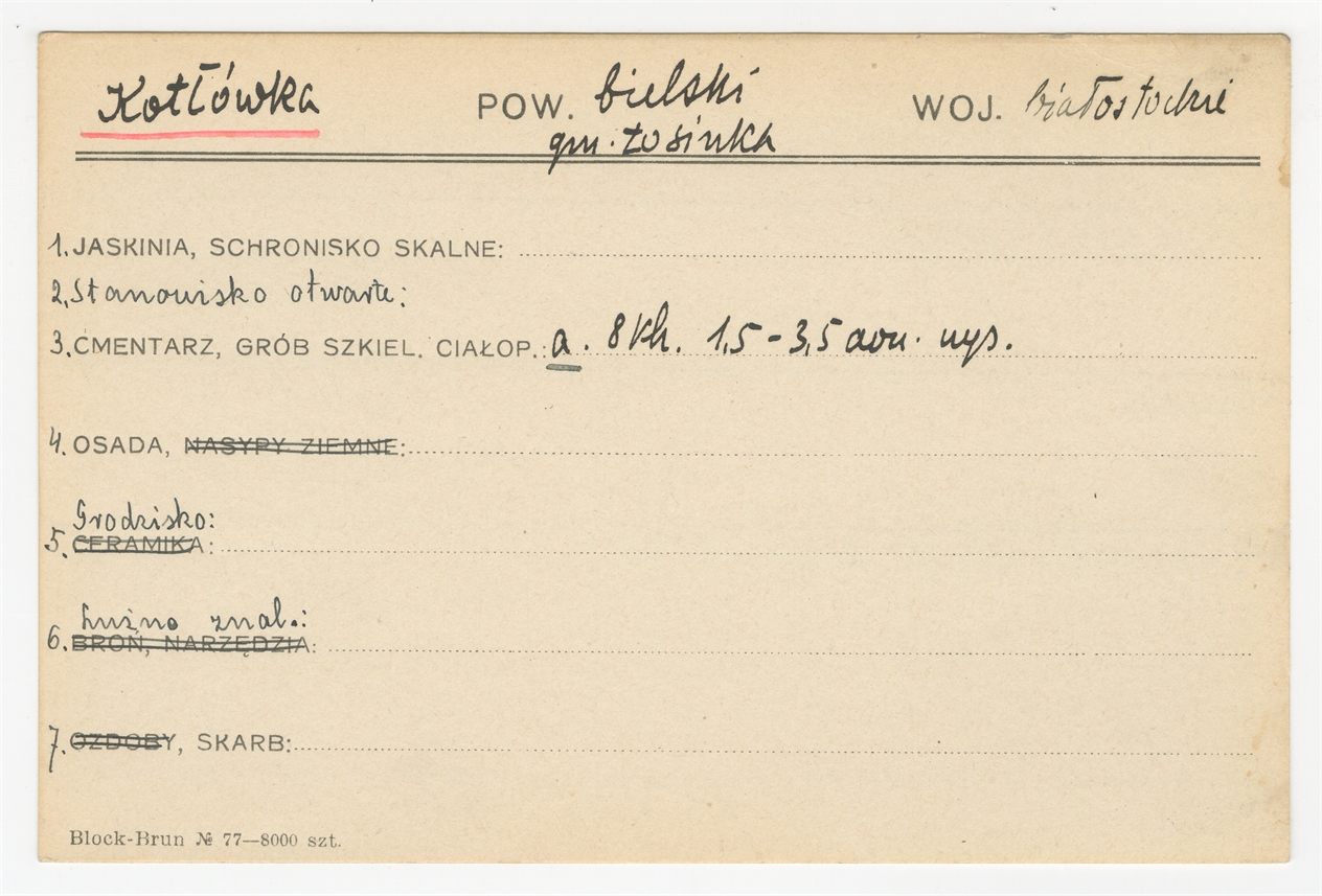 Karta stanowiska "Kotłówka gm. Łosinka pow. bielski woj. białostockie" (druk rękopis) - strona 1