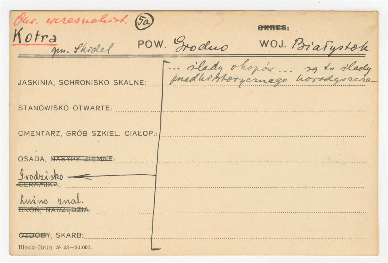 Karta stanowiska "Kotra gm. Skidel pow. Grodno woj. Białystok" (druk rękopis) - strona 1