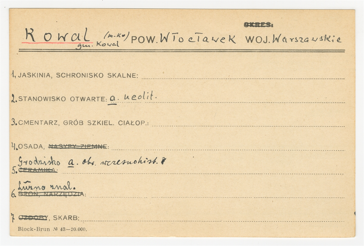 Karta stanowiska "Kowal gm. Kowal pow. Włocławek woj. Warszawskie" (druk rękopis) - strona 1