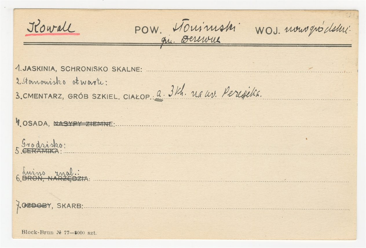Karta stanowiska "Kowale gm. Derewna pow. słonimski woj. nawogródzkie" (druk rękopis) - strona 1
