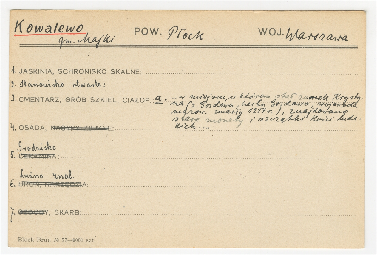 Karta stanowiska "Kowalewo gm. Majki pow. Płock woj. Warszawa" (druk rękopis) - strona 1