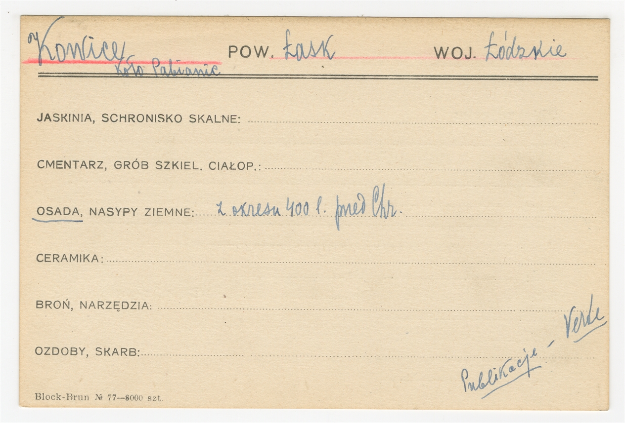 Karta stanowiska "Kowice koło Pabianic pow. Łask woj. Łódzkie" (druk rękopis) - strona 1