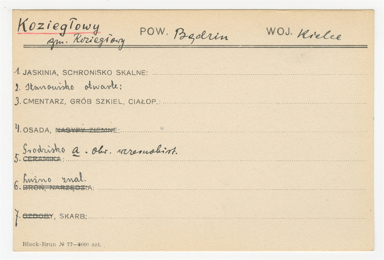 Karta stanowiska "Koziegłowy gm. Koziegłowy pow Będzin woj. Kielce" (druk rękopis) - strona 1