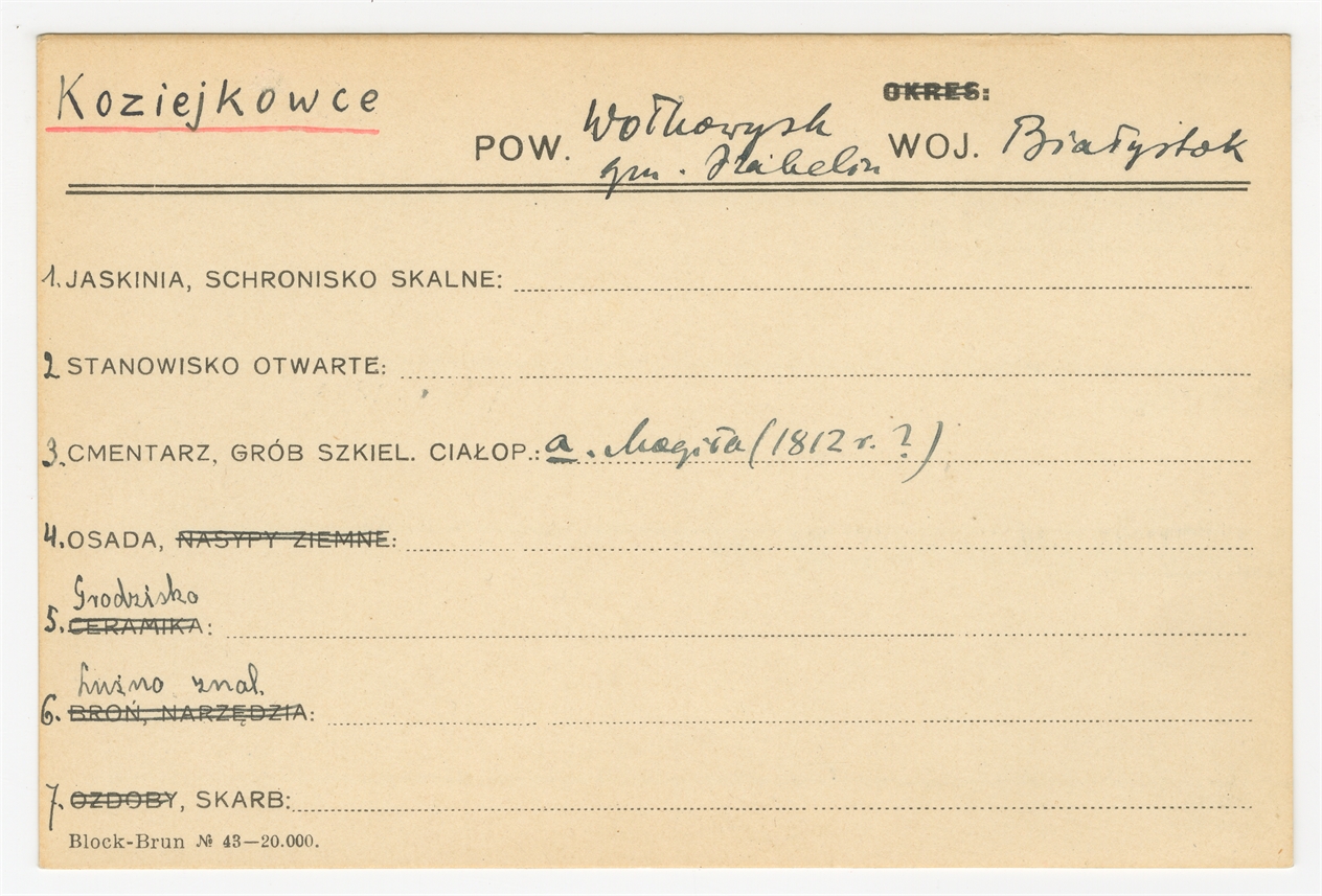 Karta stanowiska "Koziejkowice gm. Izabelin pow. Wołkowysk woj. Białystok" (druk rękopis) - strona 1