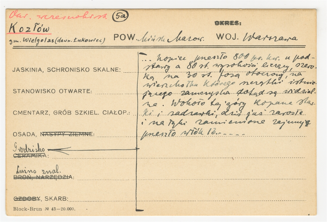Karta stanowiska "Kozłów gm. Wielgolas (dwan. Łukowiec) pow. Mińsk Mazow. woj. Warszawa" (druk rękopis) - strona 1