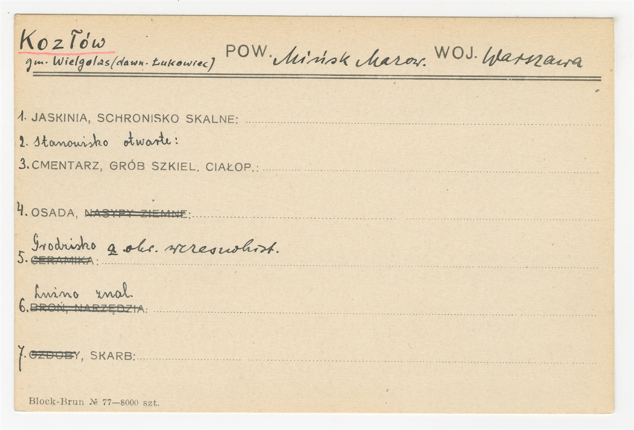 Karta stanowiska "Kozłów gm. Wielgolas (dwan. Łukowiec) pow. Mińsk Mazow. woj. Warszawa" (druk rękopis) - strona 1
