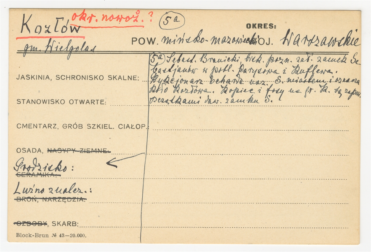 Karta stanowiska "Kozłów gm. Wielgolas pow. mińsko-mazowiecki woj. Warszawskie" (druk rękopis) - strona 1