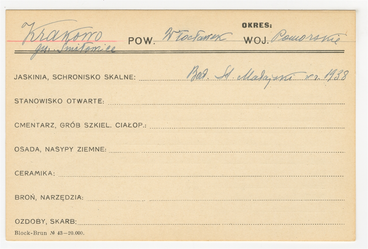 Karta stanowiska "Krakowo gm. Śmiłowice pow. Włocławek woj. Pomorskie" (druk rękopis) - strona 1