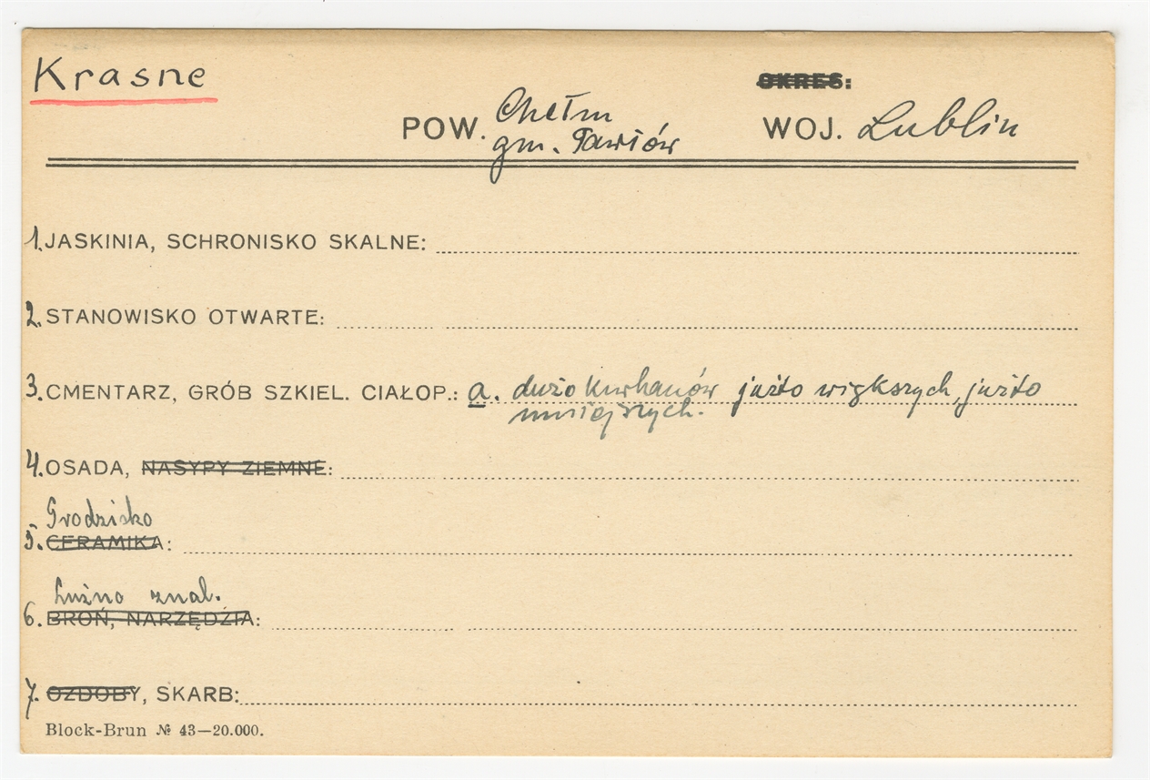 Karta stanowiska "Krasne gm. Pawłów pow. Chełm woj. Lublin" (druk rękopis) - strona 1