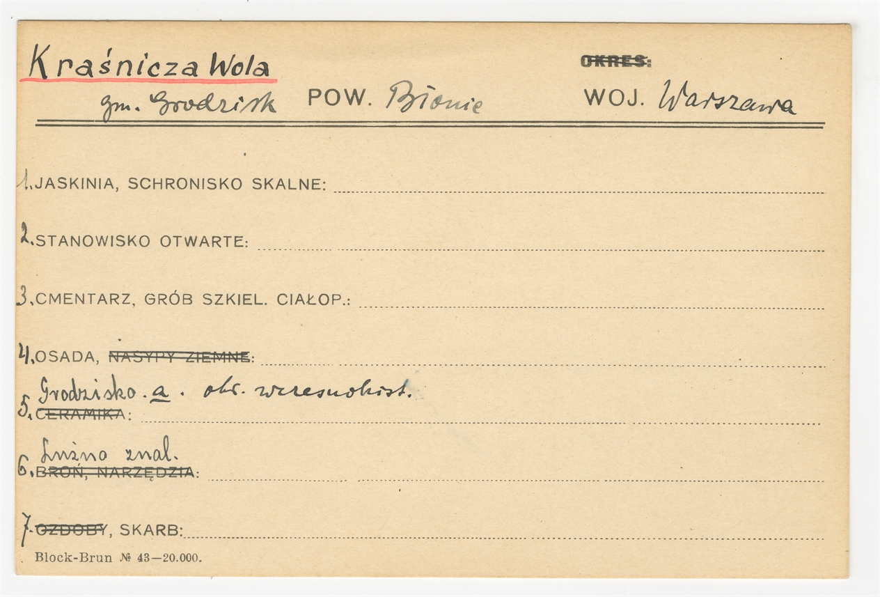 Karta stanowiska "Kraśnicza Wola gm. Grodzisk pow. Błonie woj. Warszawa" (druk rękopis) - strona 1