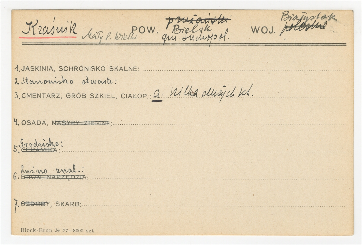 Karta stanowiska "Kraśnik Mały l. Wielki gm. Suchopol pow. Bielsk woj. Białystok" (druk rękopis) - strona 1