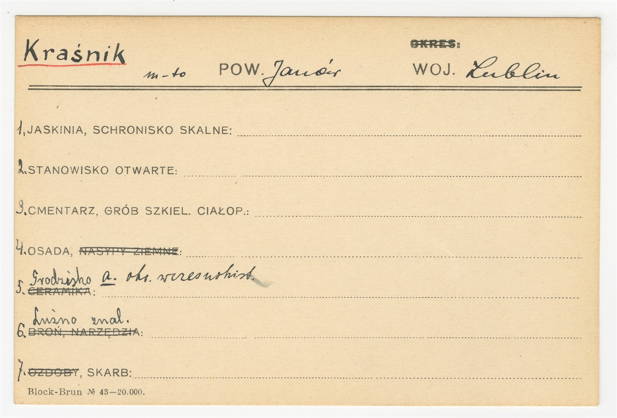 Karta stanowiska "Kraśnik pow. Janów woj. Lublin" (druk rękopis) - strona 1
