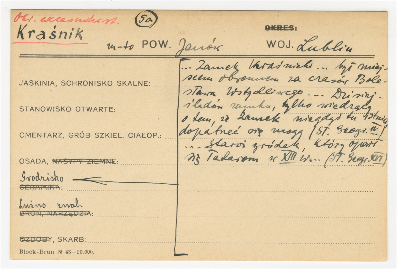 Karta stanowiska "Kraśnik pow. Janów woj. Lublin" (druk rękopis) - strona 1