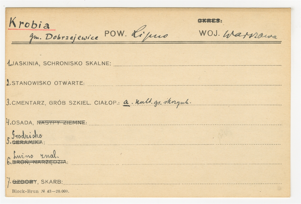 Karta stanowiska "Krobia gm. Dobrzejowice pow. Lipno woj. Warszawa" (druk rękopis) - strona 1