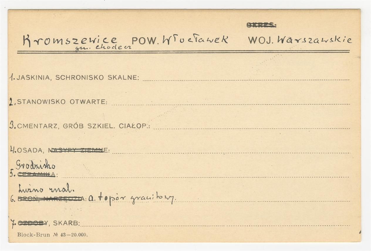 Karta stanowiska "Kromszewice gm. Chodecz pow. Włocławek woj. Warszawskie" (druk rękopis) - strona 1