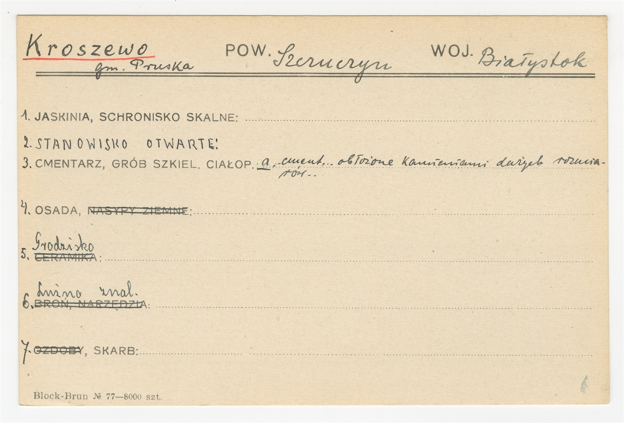 Karta stanowiska "Kroszewo gm. Pruska pow. Szczuczyn woj. Białystok" (druk rękopis) - strona 1