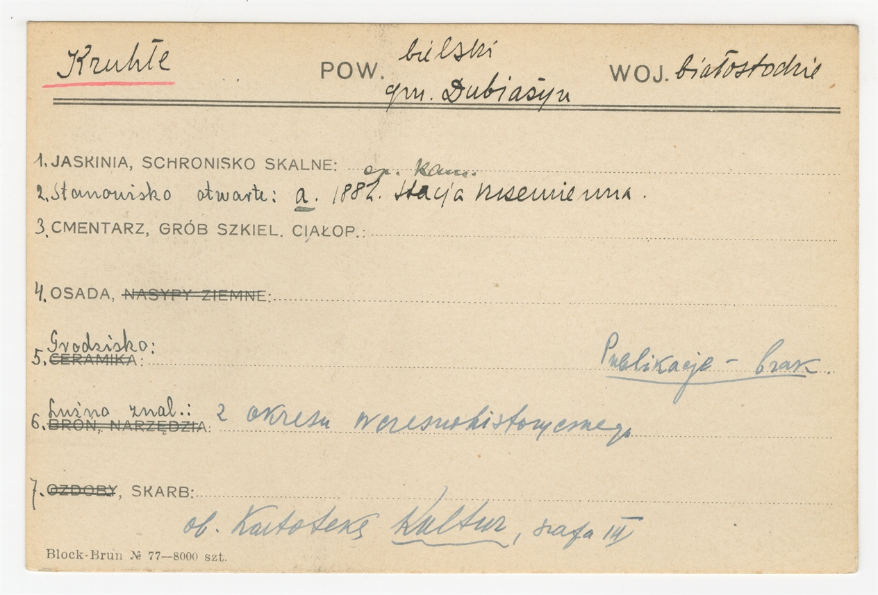 Karta stanowiska "Kruhłe gm. Dubiażyn pow. bielski woj. białostockie" (druk rękopis) - strona 1