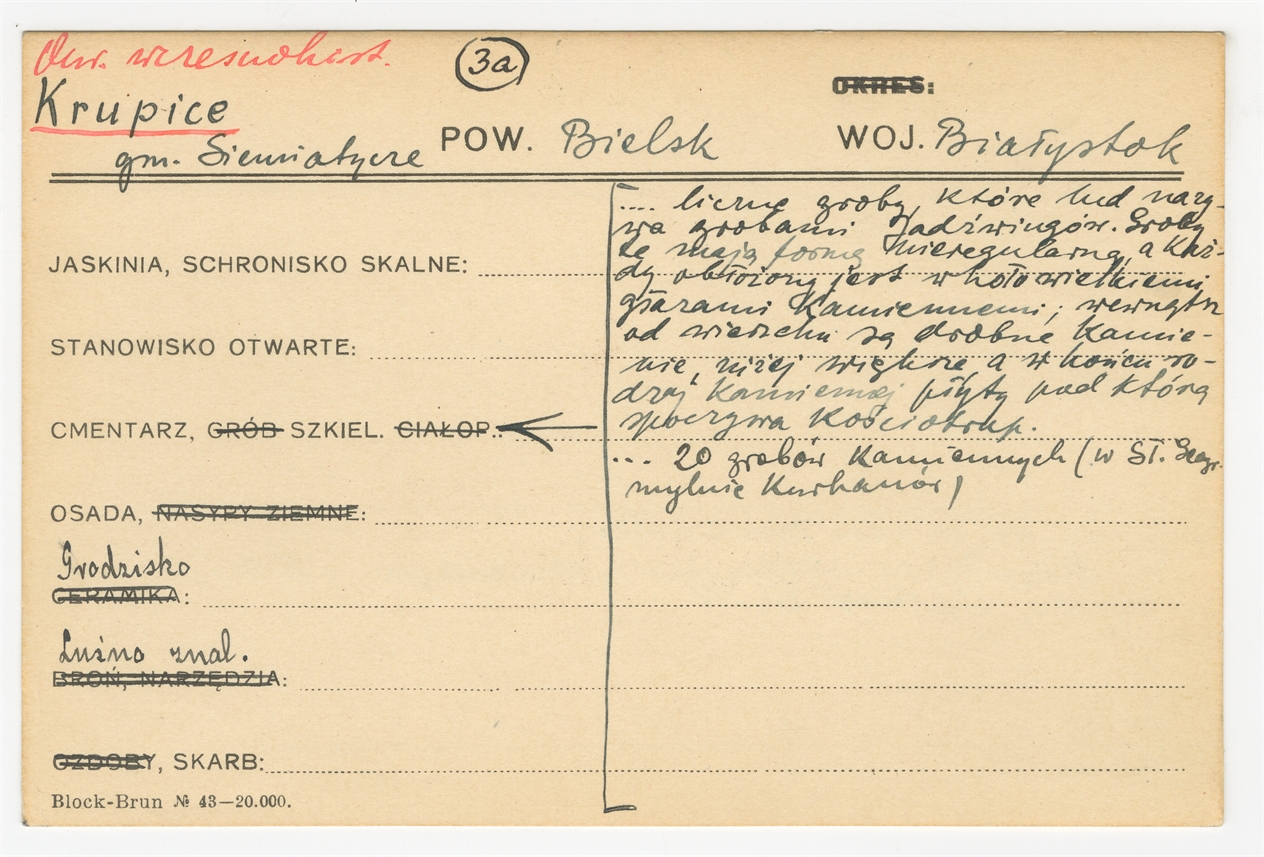 Karta stanowiska "Krupice gm. Siemiatycze pow. Bielsk woj. Białystok" (druk rękopis) - strona 1