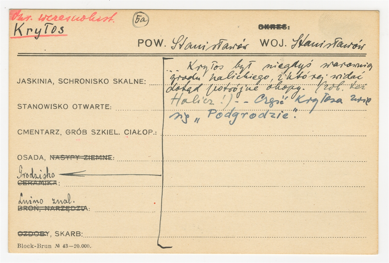 Karta stanowiska "Kryłos pow. Stanisławów woj. Stanisławów" (druk rękopis) - strona 1