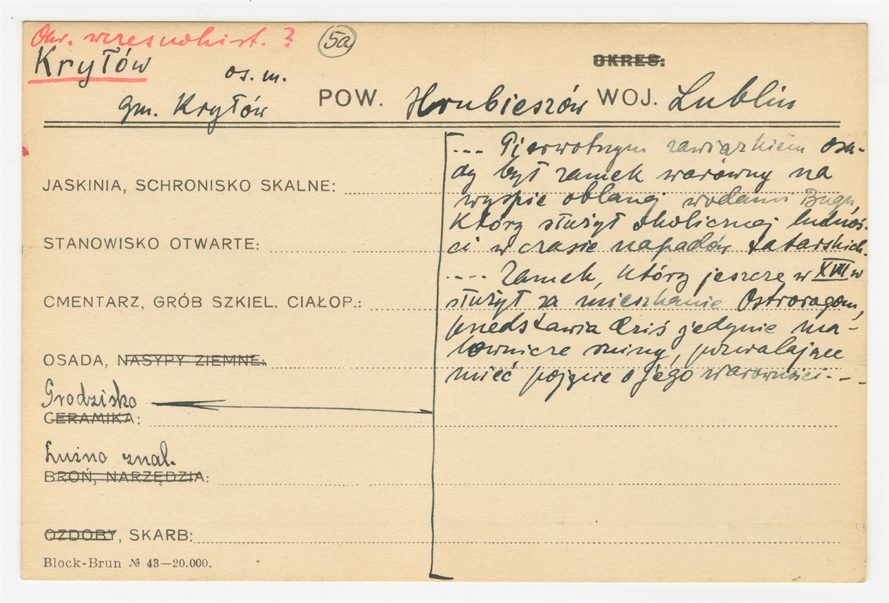 Karta stanowiska "Kryłów gm. Kryłów pow. Hrubieszów woj. Lublin" (druk rękopis) - strona 1