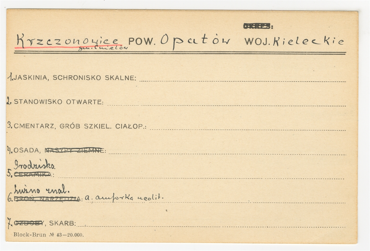 Karta stanowiska "Krzczonowice gm. Ćmielów pow. Opatów woj. Kieleckie" (druk rękopis) - strona 1