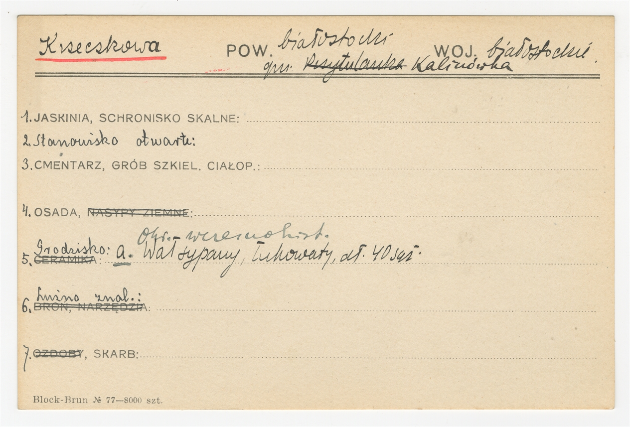 Karta stanowiska "Krzeczkowa gm. Kalinówka pow. białostocki woj. białostockie" (druk rękopis) - strona 1