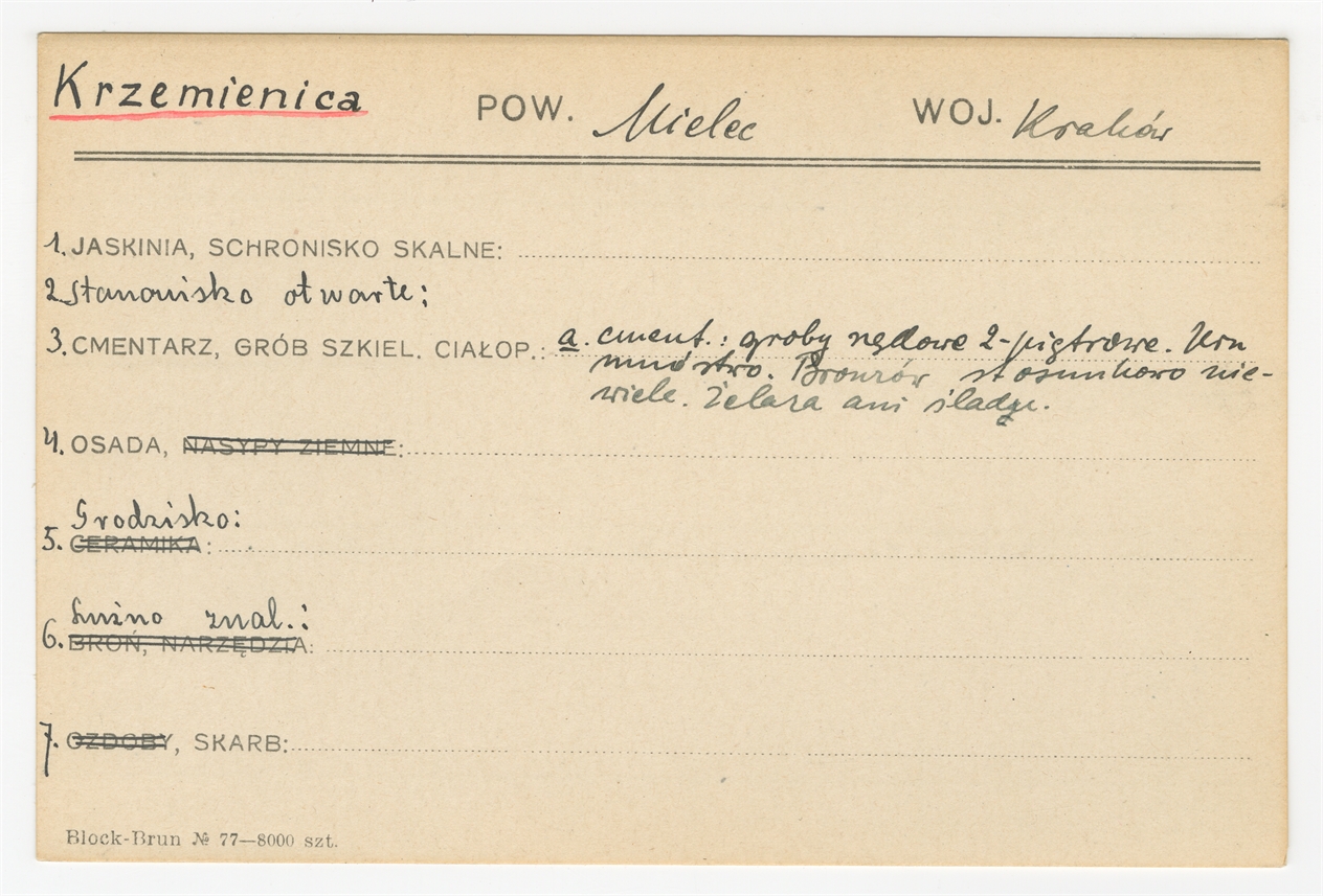 Karta stanowiska "Krzemienica pow. Mielec woj. Kraków" (druk rękopis) - strona 1