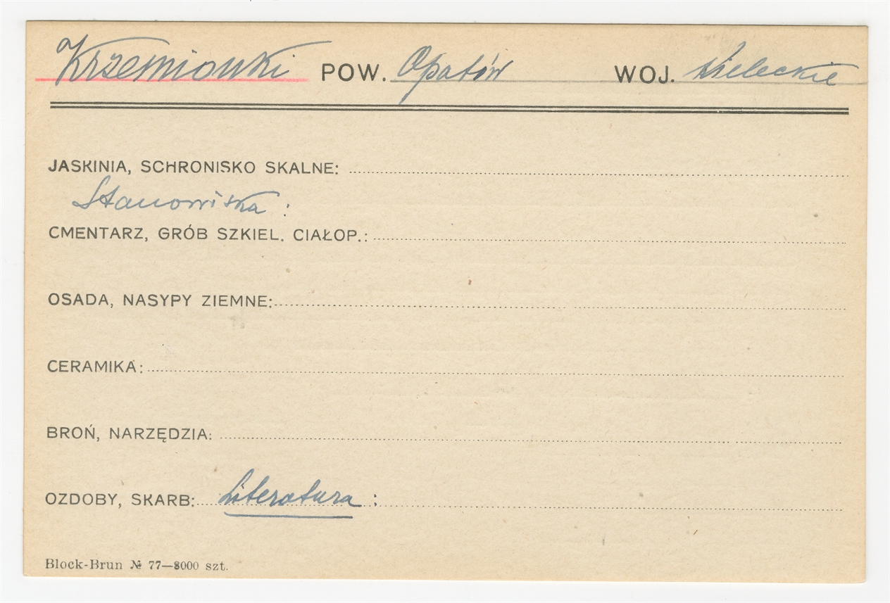 Karta stanowiska "Krzemionki pow. Opatów woj. Kieleckie" (druk rękopis) - strona 1