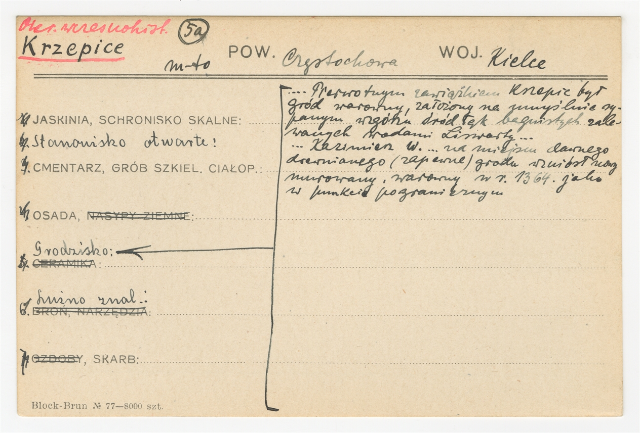 Karta stanowiska "Krzepice pow. Częstochowa woj. Kielce" (druk rękopis) - strona 1