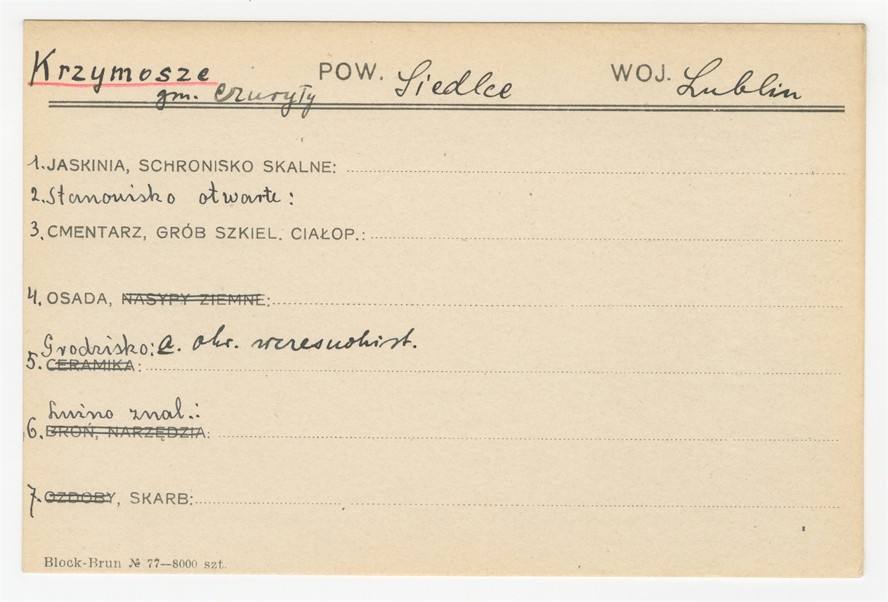 Karta stanowiska "Krzymosze gm. Czuryły pow. Siedlce woj. Lublin" (druk rękopis) - strona 1