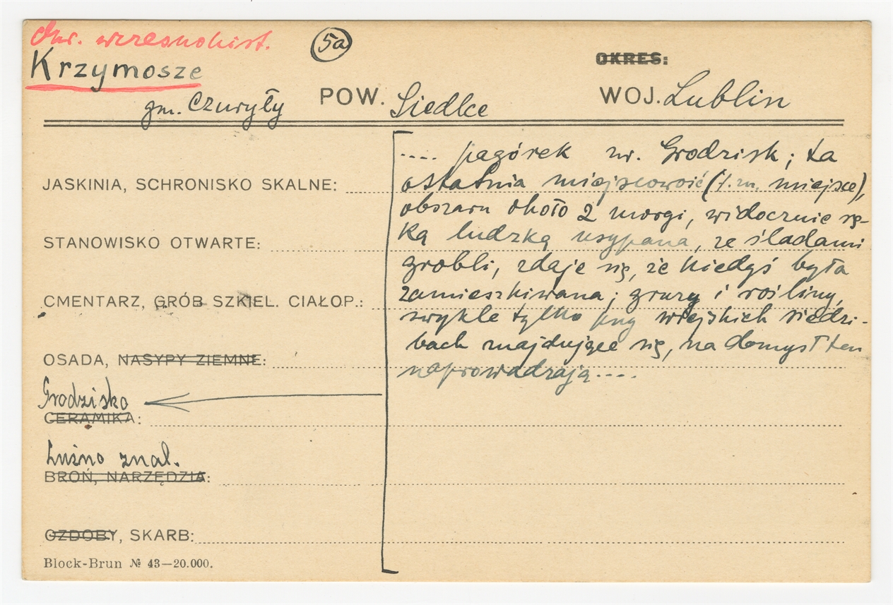 Karta stanowiska "Krzymosze gm. Czuryły pow. Siedlce woj. Lublin" (druk rękopis) - strona 1