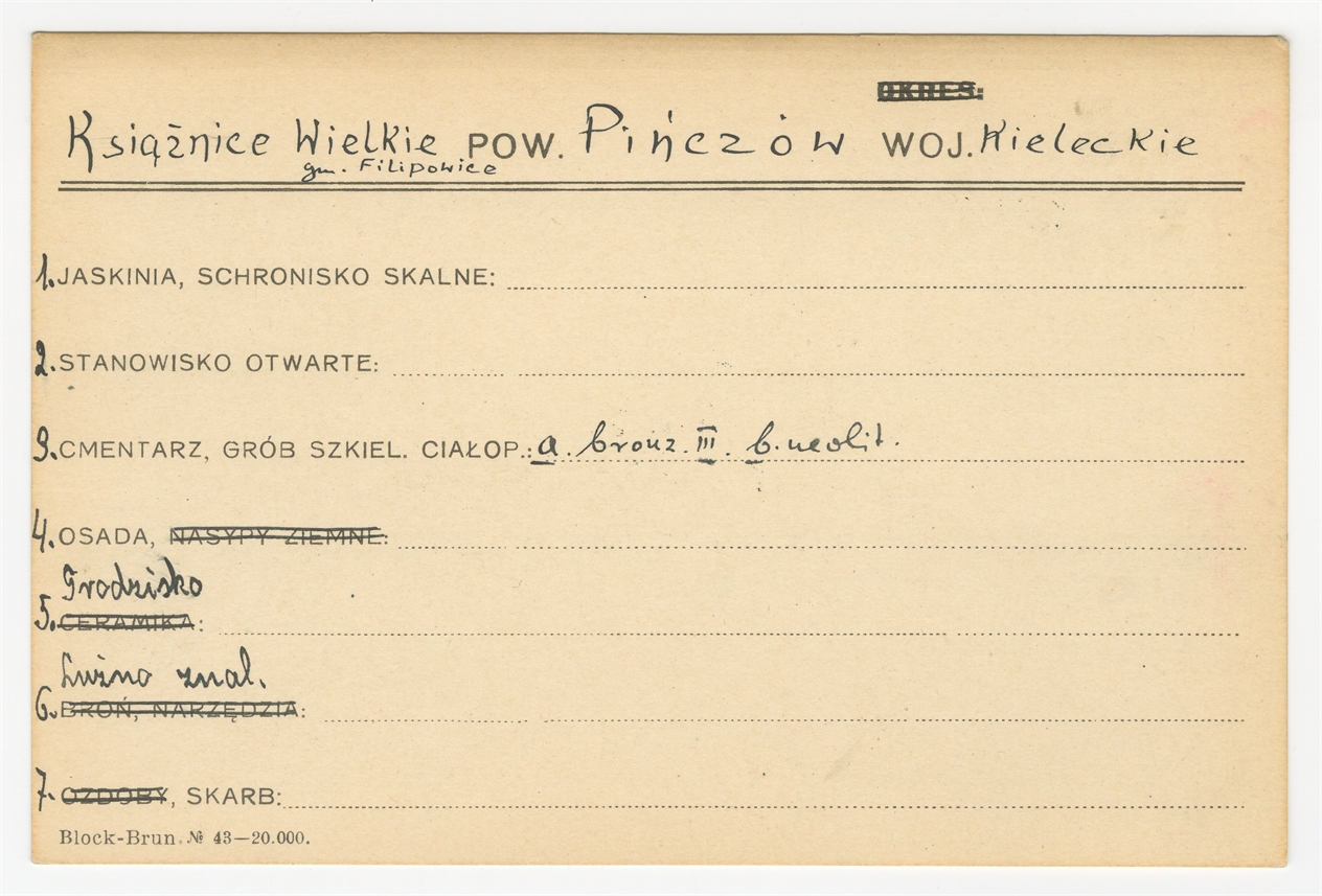 Karta stanowiska "Książnice Wielkie gm. Filipowice pow. Pińczów woj. Kieleckie" (druk rękopis) - strona 1