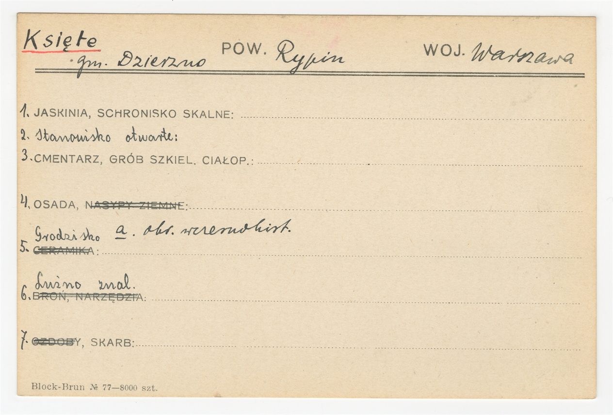 Karta stanowiska "Księte gm. Dzierzno pow. Rypin woj. Warszawa" (druk rękopis) - strona 1