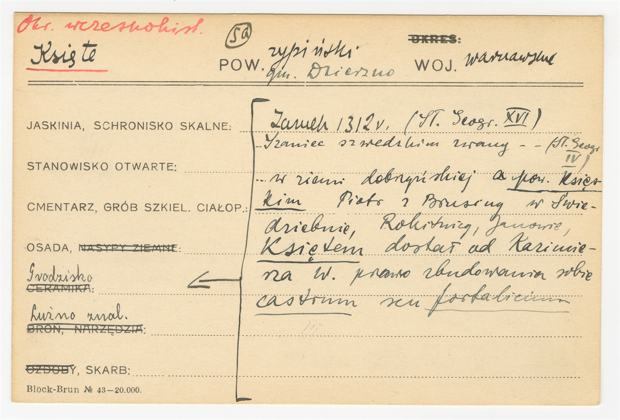 Karta stanowiska "Księte gm. Dzierzno pow. rypiński woj. warszawskie" (druk rękopis) - strona 1