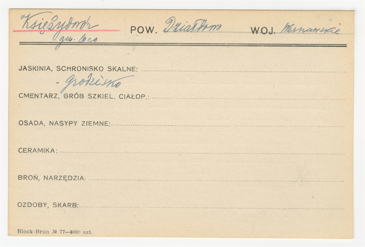 Karta stanowiska "Księżydwór gm. loco pow. Działdowo woj. Warszawskie" (druk rękopis) - strona 1
