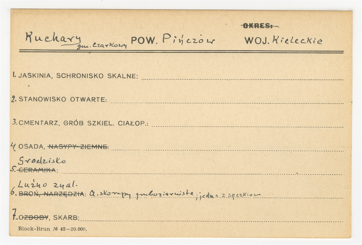 Karta stanowiska "Kuchary gm. Czarkowa pow. Pińczów woj. Kieleckie" (druk rękopis) - strona 1