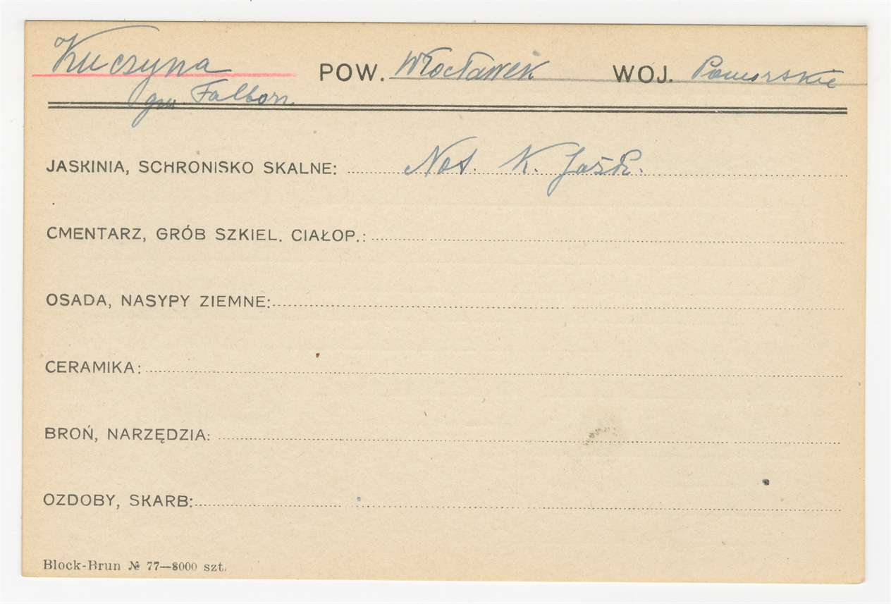 Karta stanowiska "Kuczyna gm. Falborz pow. Włocławek woj. Pomorskie" (druk rękopis) - strona 1