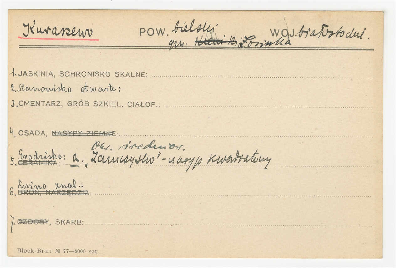 Karta stanowiska "Kuraszewo gm. Łosinka pow. bielski woj. białostockie" (druk rękopis) - strona 1