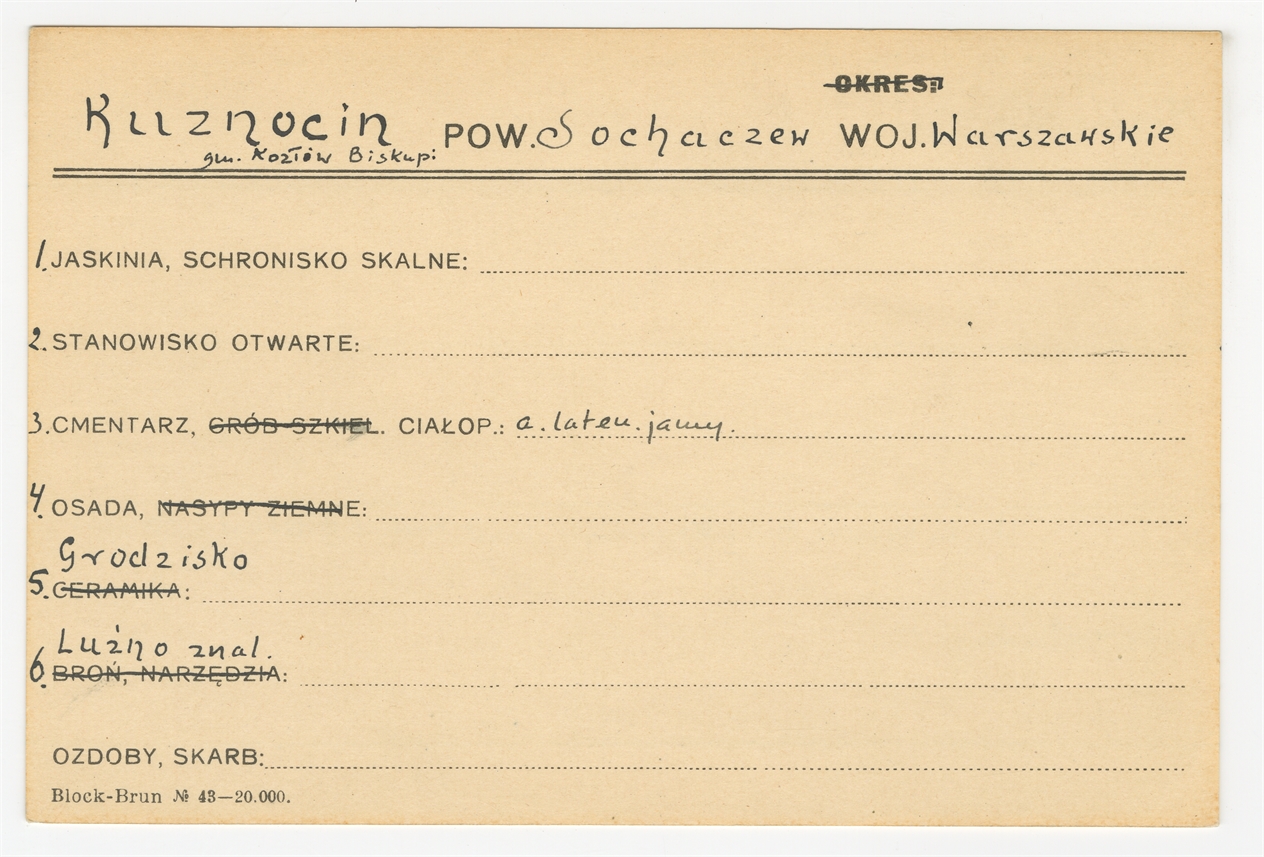 Karta stanowiska "Kuznocin gm. Kozłów Biskupi pow. Sochaczew woj. Warszawskie" (druk rękopis) - strona 1