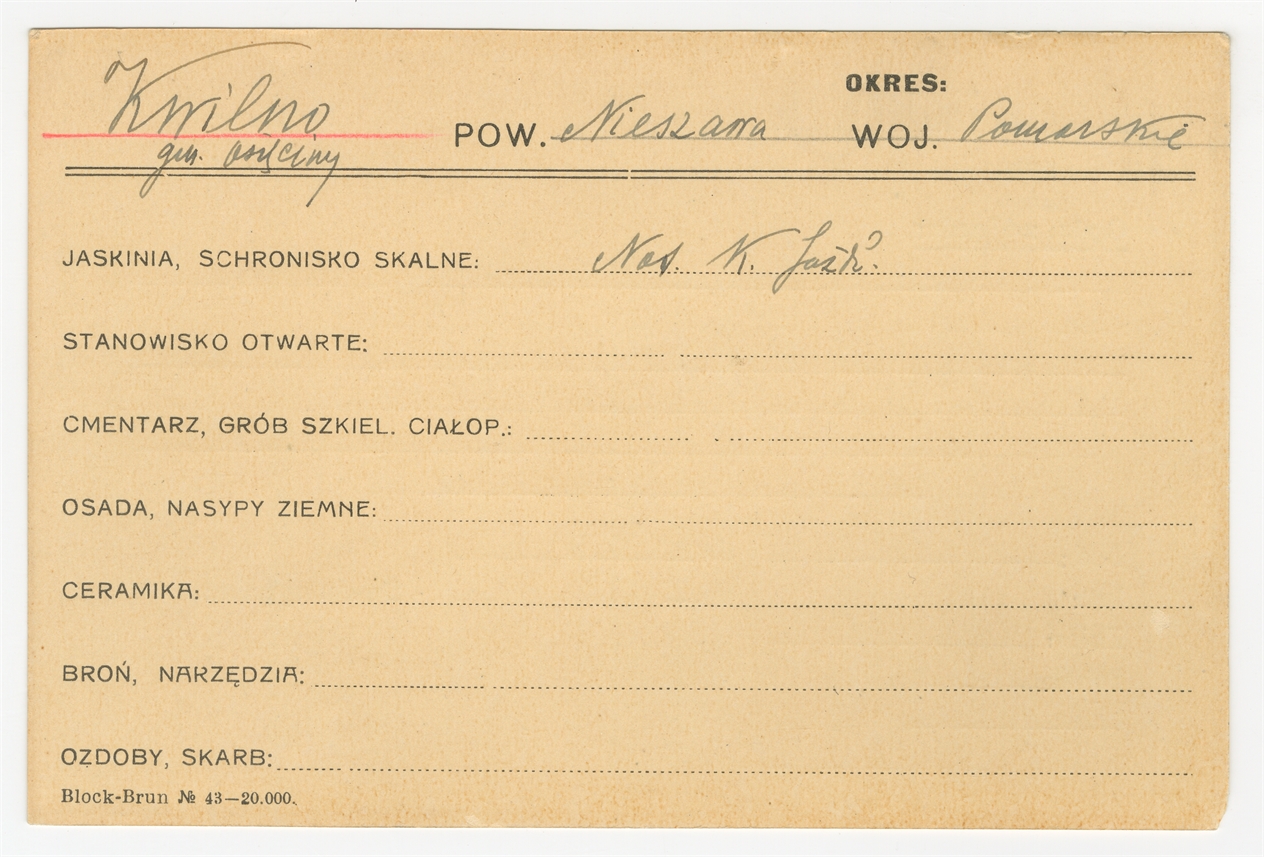 Karta stanowiska "Kwilno gm. Osięciny pow. Nieszawa woj. Pomorskie" (druk rękopis) - strona 1
