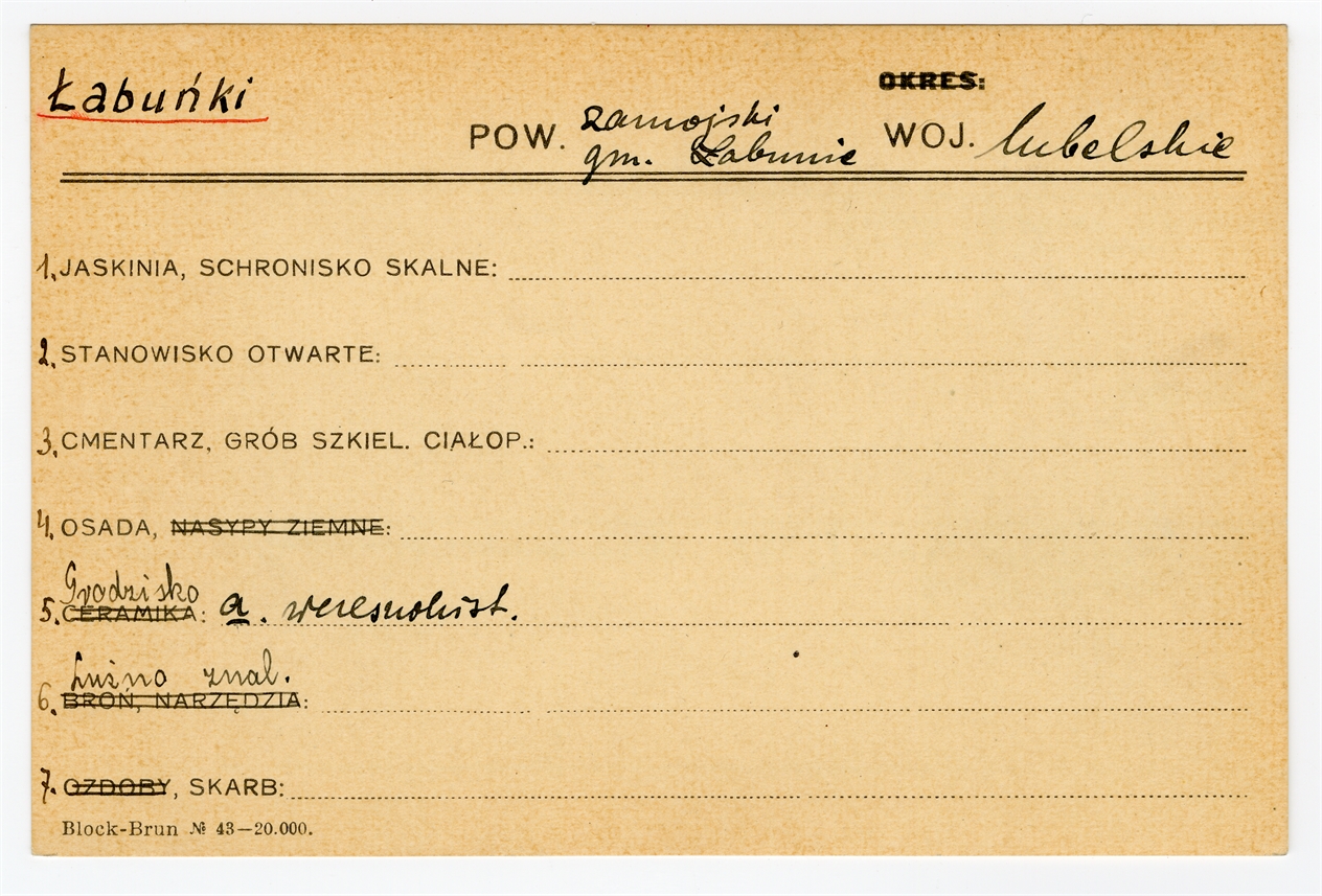 Karta stanowiska "Łabuńki gm. Łabunie pow. Zamojski woj. lubelski" (druk rękopis) - strona 1